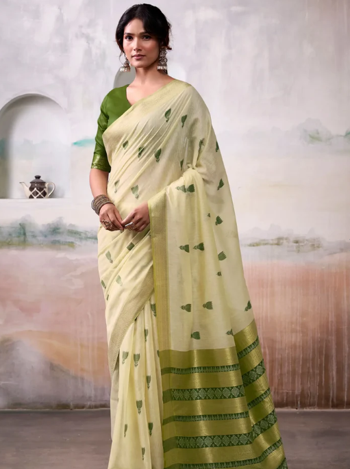 A cotton saree, on the other hand, has a more relaxed but still interesting atmosphere. A cotton saree is a great choice for warm weather and casual or semi-formal parties because it is breathable and comfortable. For hundreds of years, people have chosen cotton as their fabric of choice. In India, it is used a lot for everyday clothes. Cotton saree are quite comfy, which helps the person wearing them keep cool and calm all day. Most of the time, these sarees have simple, exquisite motifs that show off how beautiful the cloth is.