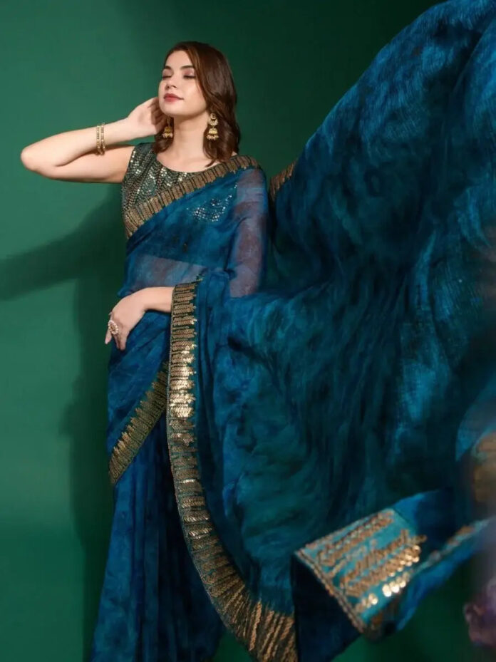 People have known for a long time that chiffon sarees are light, delicate, and very beautiful. The fabric’s translucent quality makes it easy to move, so it’s great for both formal and casual parties. Chiffon is a man-made fabric, yet it’s quite light, which makes it really comfortable and lets you move around without losing style. A chiffon saree is beautiful because of how soft it feels and how it hangs, which makes the person wearing it feel classy and poised.